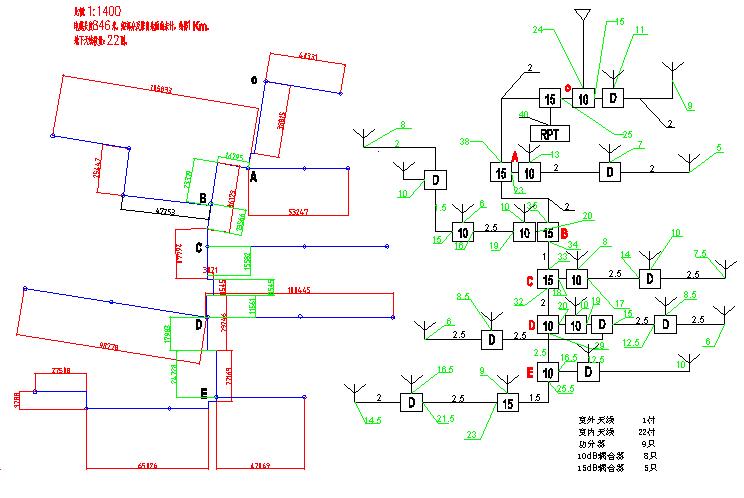 根据用户需求及现场场强测试,系统电缆布线图及场强分布图如下所示: